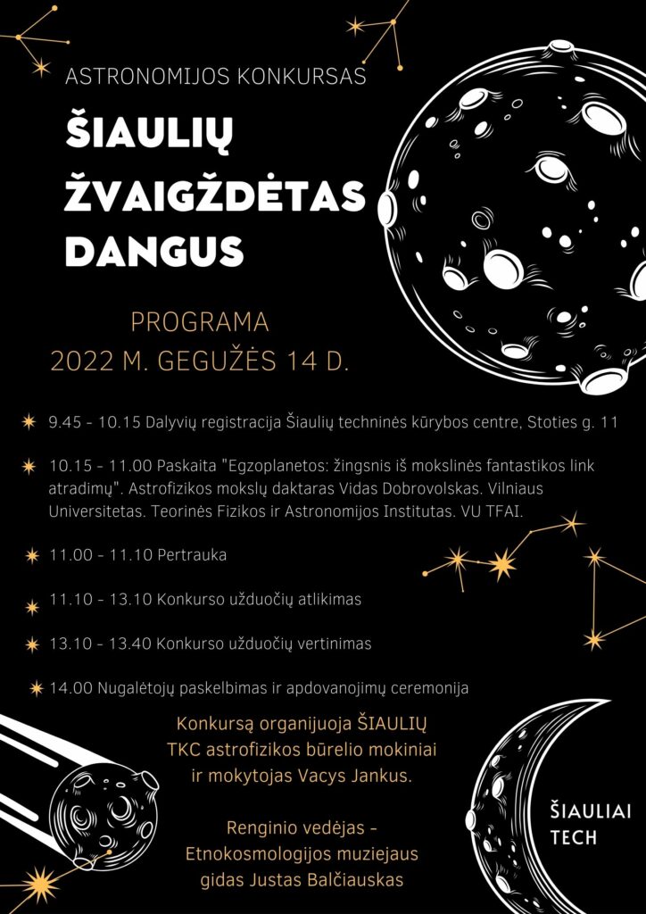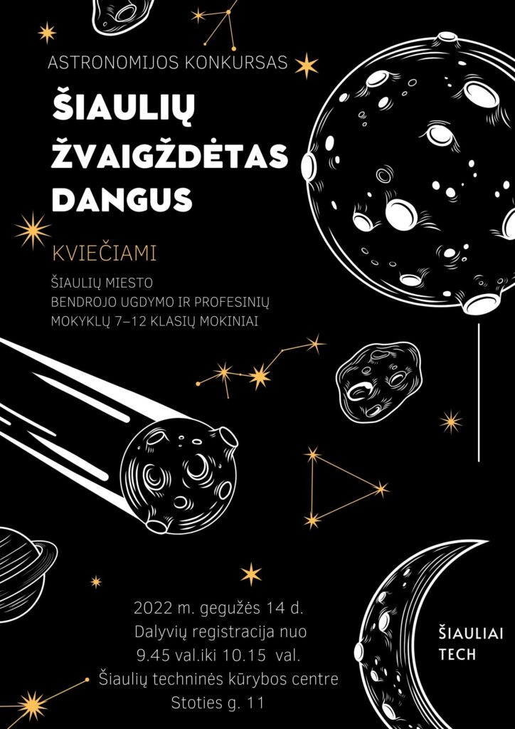 Šiaulių techninės kūrybos centras organizuoja astronomijos konkursą „Šiaulių žvaigždėtas dangus”, kuris skirtas Šiaulių bendrojo ugdymo ir profesinio ugdymo mokyklų 7-12 klasių mokiniams.
