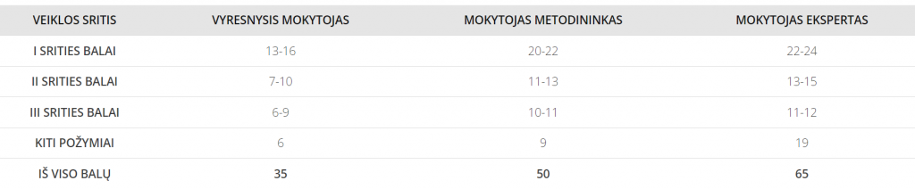 Mokytojui pretenduojančiam įgyti atitinkamą kvalifikacinę kategoriją, privalu surinkti atitinkamą balų skaičių: