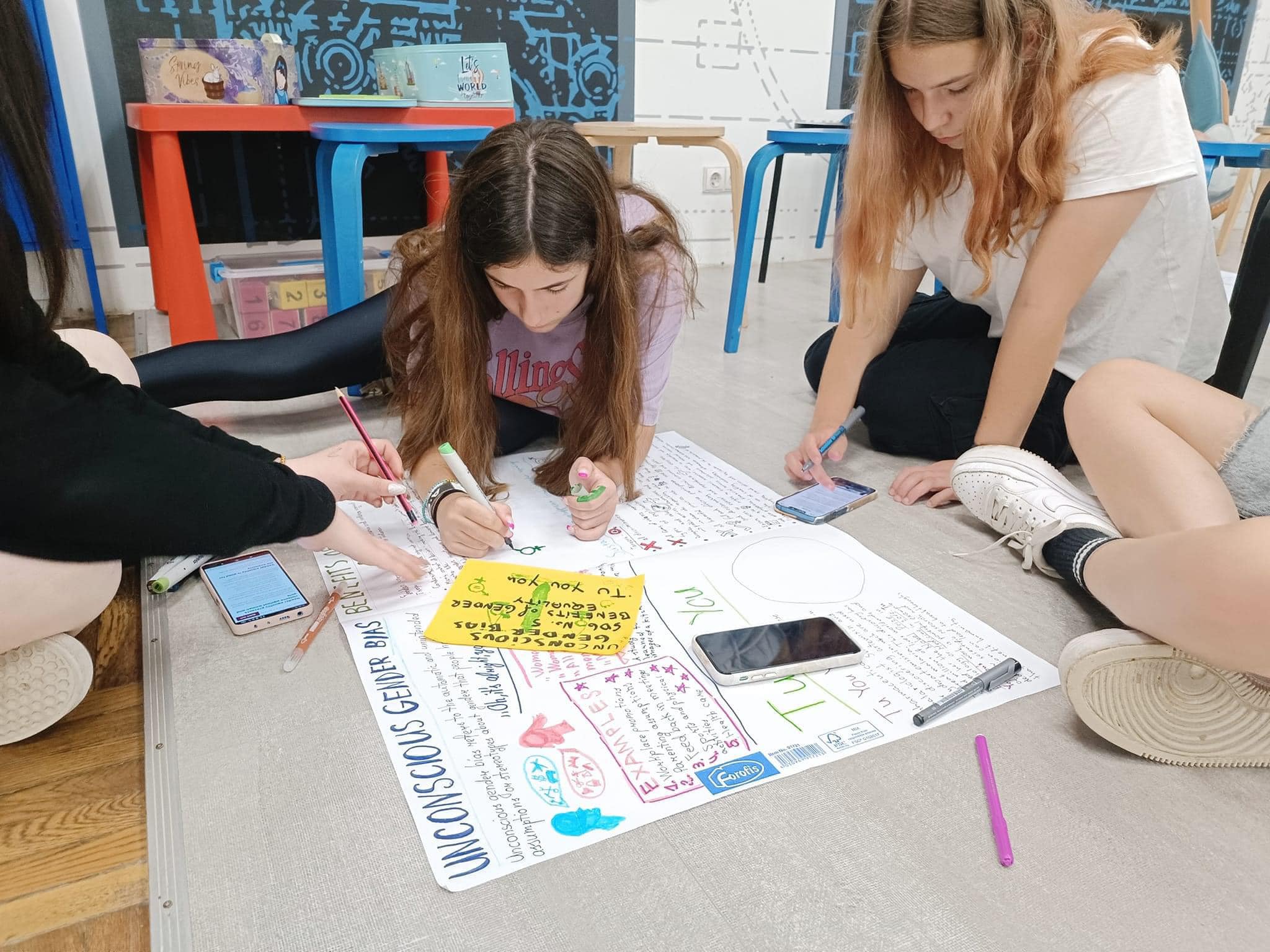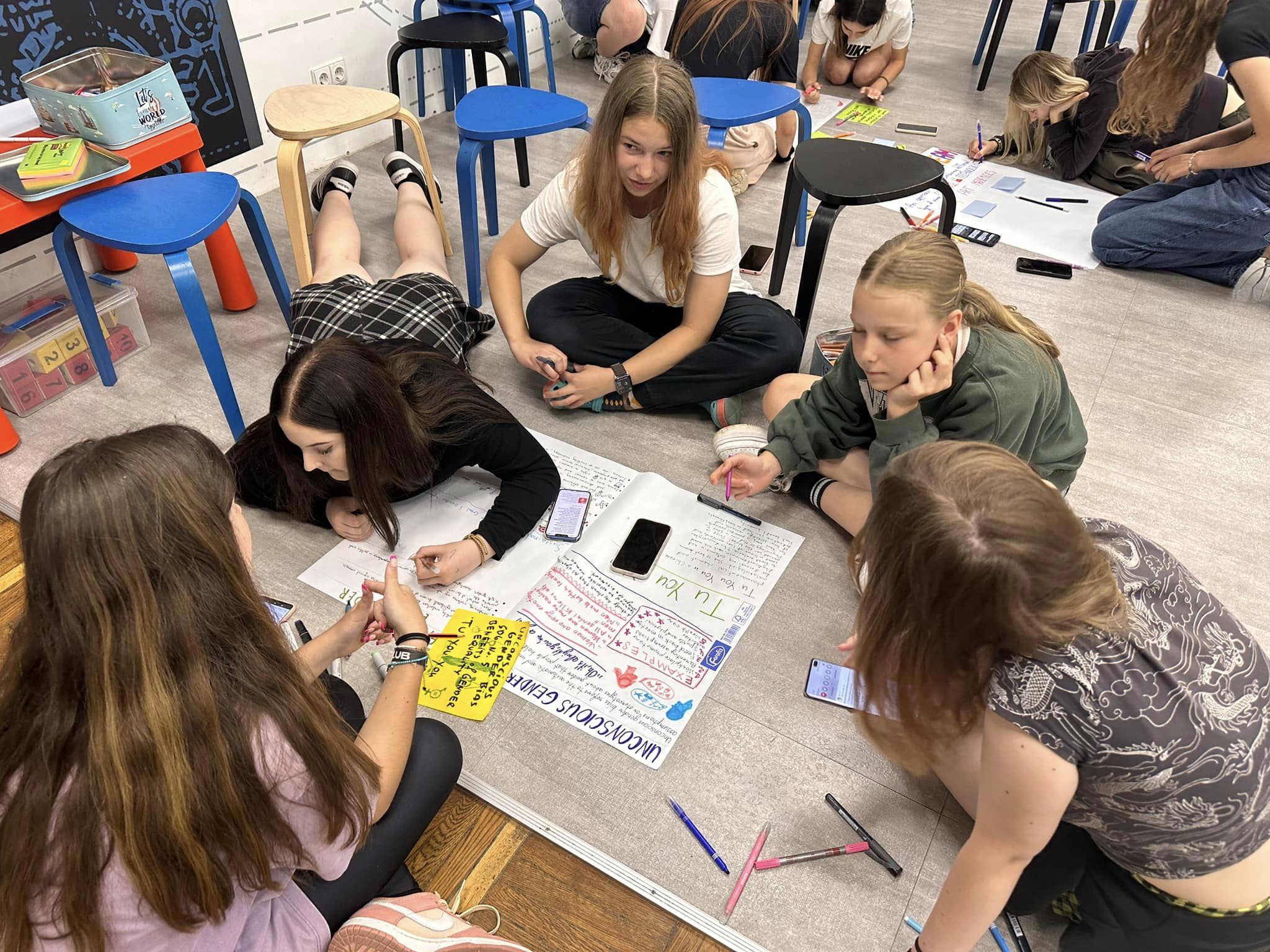 Pirmą jaunimo mainų dieną merginos gilinosi į lyčių ir lyčių lygybės teorijas ir situaciją pasaulyje. Buvo nagrinėjamos merginų ir moterų atstovavimo temos, moterų galimybės ir perspektyvos STEAM profesijose, diskutuota kaip galime įveikti lyčių stereotipus. Taip pat domėjomės moterų sėkmės istorijomis STEAM srityse ir jų nuveiktais darbais didžiausiuose pasaulio mokslo atradimuose. Jaunimo mainų dalyvės pastebėjo, kad nors ir ėsti nusistovėję stereotipai apie STEAM profesijas, jos yra atviros ir prieinamos visiems.
