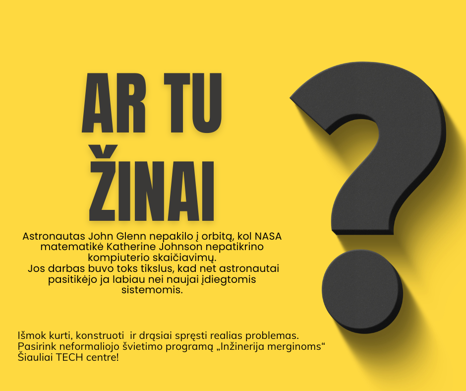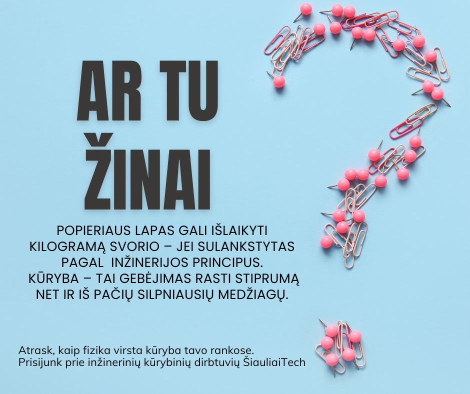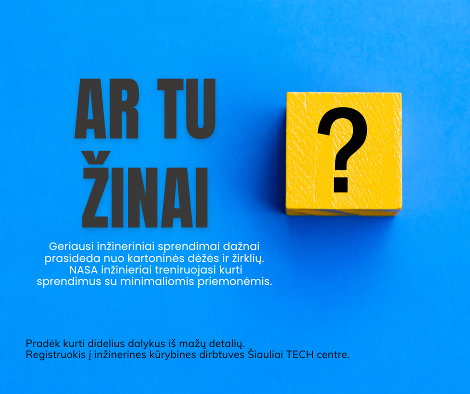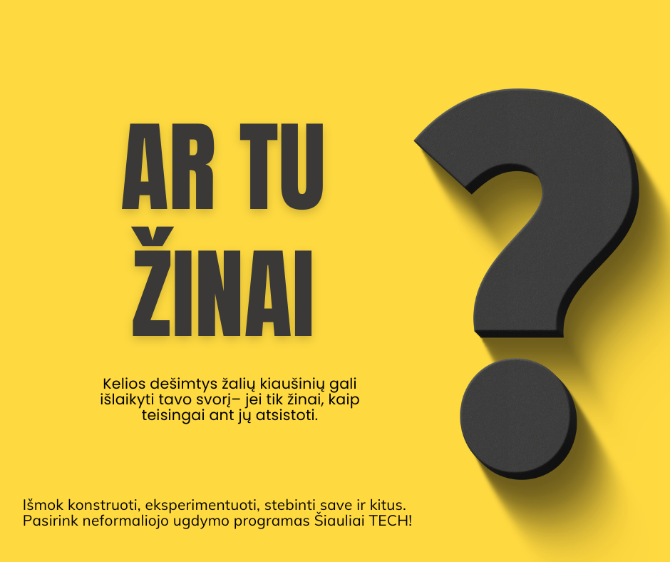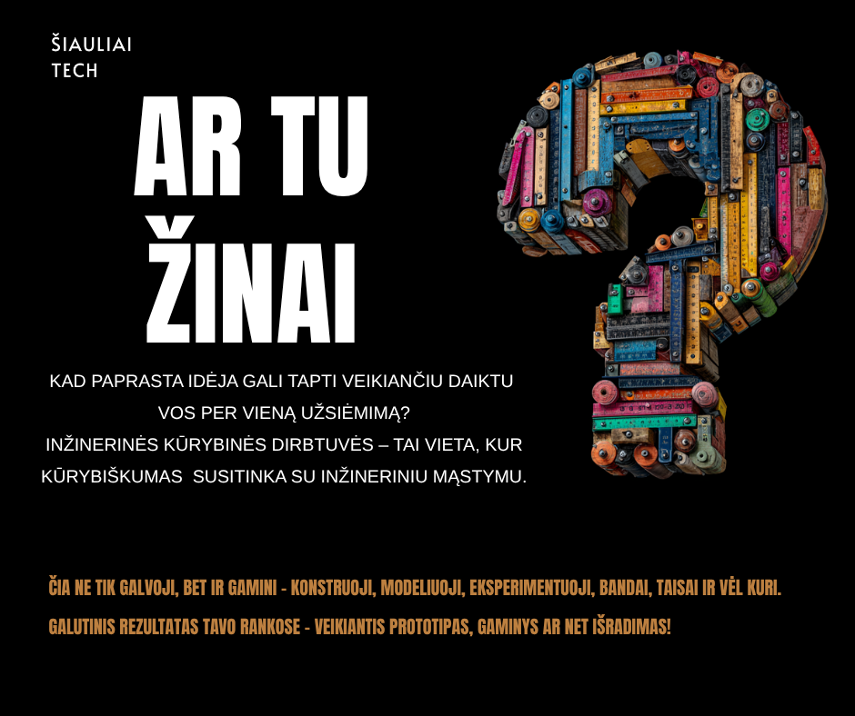 Šiaulių techninės kūrybos centras – tai vieta, kur vaikai atranda savo stiprybes, kuria ir mokosi drąsiai žengti į ateitį. Čia kiekvienas užsiėmimas tampa nuotykiu, o kiekviena idėja – galimybe. Registracija į 2025–2026 mokslo metų programas jau prasidėjo. Nepraleiskite progos suteikti savo vaikui erdvę kurti, tyrinėti ir augti kartu su šauniais mokytojais bei draugiška bendruomene.