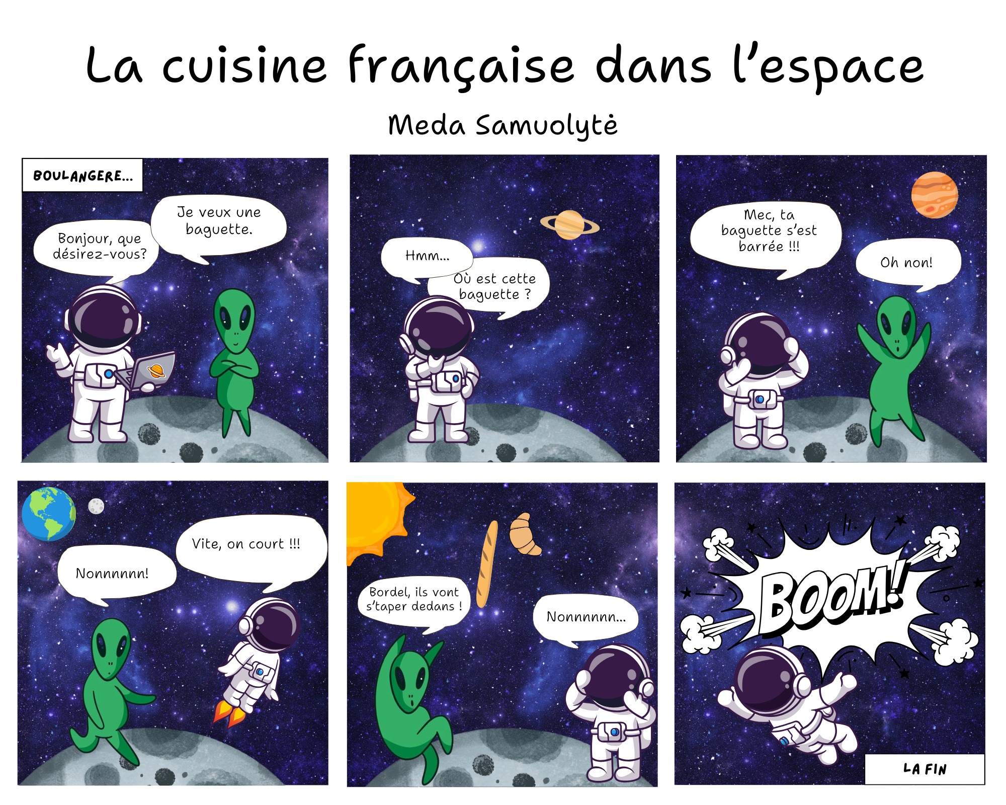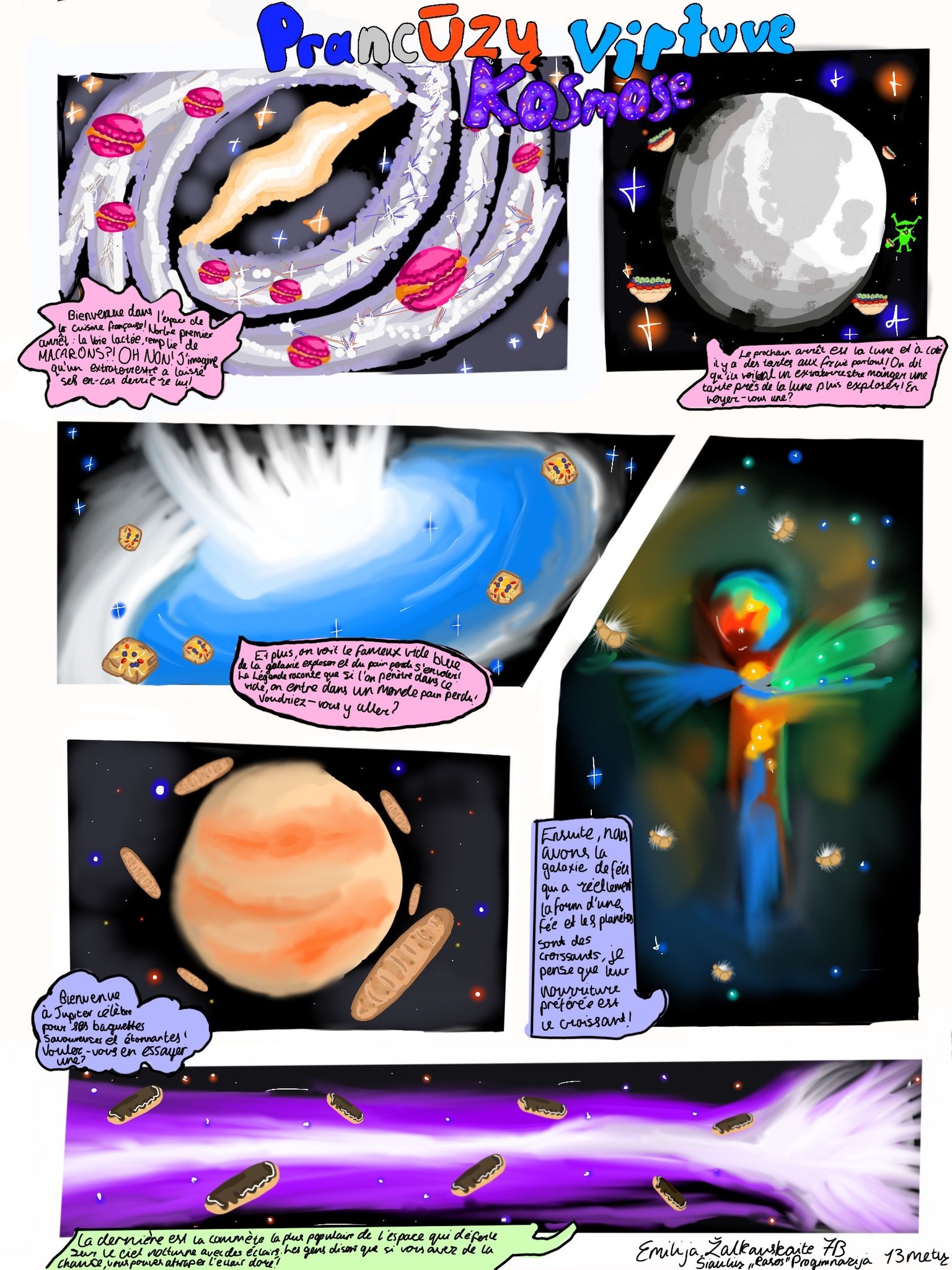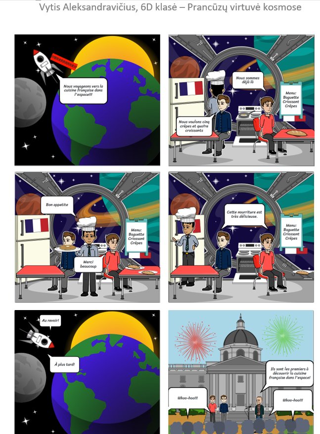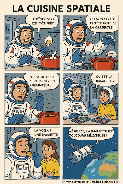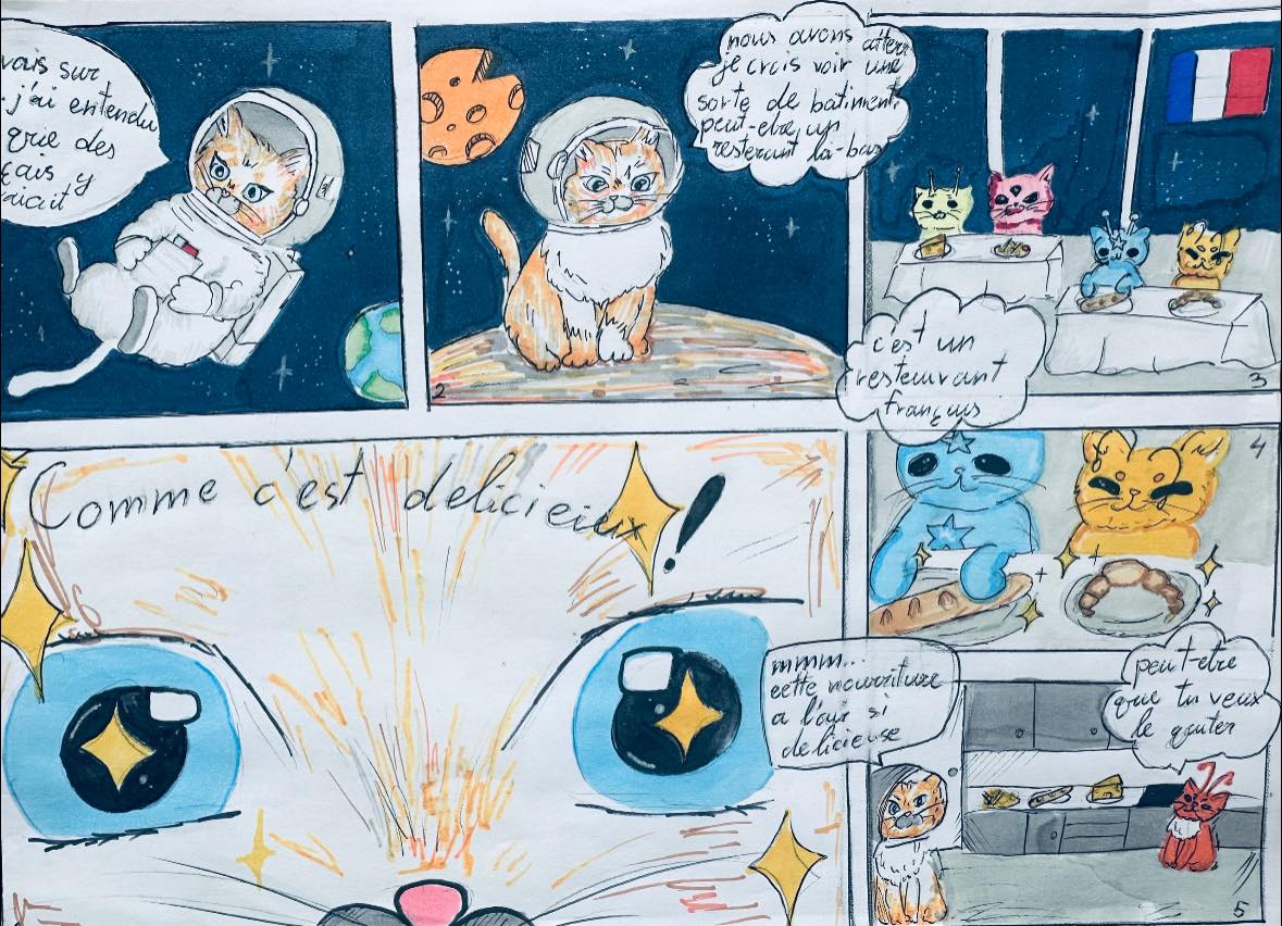 Konkursas kvietė 6–10 klasių mokinius pasitelkti kūrybiškumą, prancūzų kalbos žinias ir vaizduotę, kuriant komiksus apie netikėtas kulinarines situacijas kosminėje erdvėje. Konkursiniai darbai stebino ne tik temų įvairove, bet ir originaliais sprendimais bei puikia prancūzų kalba. Mokinių darbuose susipynė humoras, fantastika ir gastronomija – nuo svyruojančių beze debesų iki išsiveržusio skysto azoto.