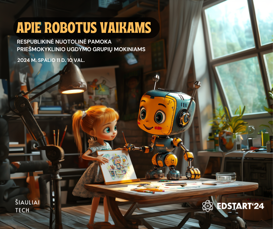2024 m. spalio 11 d. 10 val. vyks nuotolinė pamoka „Apie robotus vaikams“ per Zoom platformą, kurios metu vaikai galės gilinti savo žinias apie robotų technologijas ir jų panaudojimą. Numatoma pamokos trukmė 30 min. Registracija į pamoką: https://forms.gle/KCTyMCCcxBuakfrs9