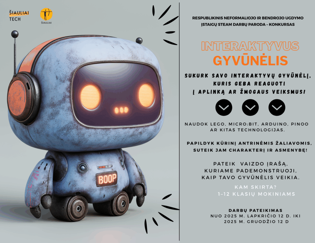 Šiaulių techninės kūrybos centras kviečia visus neformaliojo ir bendrojo ugdymo mokytojus kartu su savo mokiniais dalyvauti respublikiniame STEAM darbų konkurse-parodoje „Interaktyvus gyvūnėlis“.