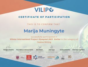 Sveikiname Astrofizikos būrelio mokinę Mariją Muningytę, kuri tarptautinėje mokinių projektų olimpiadoje Vilnius International Project Olympiad – VILIPO tarptautiniame etape pelnė sidabro medalį. Nacionaliniame etape Marija pelnė bronzos medalį.