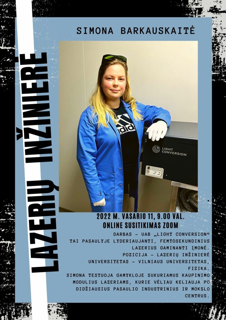 9.00 val. – Simona Barkauskaitė, lazerių inžinierė. Darbas – UAB „Light Conversion“, pasaulyje lyderiaujanti, femtosekundinius lazerius gaminanti įmonė.