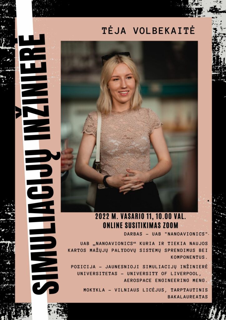 10.00 val. – Tėja Volbekaitė, simuliacijų inžinierė. Darbas – UAB „NanoAvionics“, kurie kuria ir tiekia naujos kartos mažųjų palydovų sistemų sprendimus bei komponentus. Universitetas – University of Liverpool, Aerospace Engineering MEng.