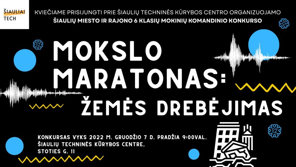 Kviečiame į Šiaulių miesto ir rajono 6 klasių mokinių komandinį konkursą „Mokslo maratonas: žemės drebėjimas“. Konkurso organizatorius: Šiaulių techninės kūrybos centras, Stoties g. 11. Šis renginys yra tarptautinės STEAM konferencijos EdStart Šiauliai 2022 dalis.