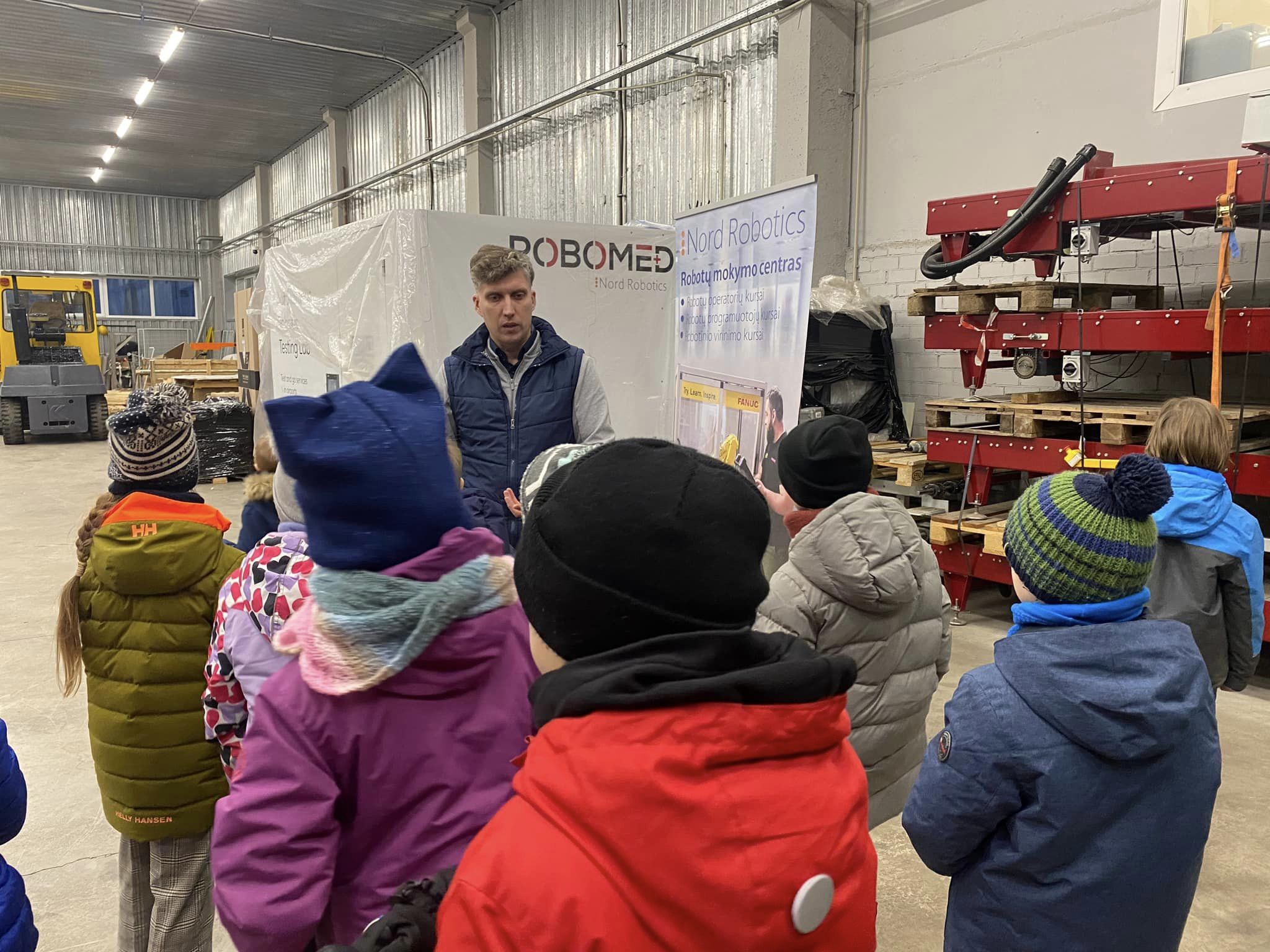 Įmonės vadovas Andrius Grudžinskas papasakojo mokiniams kokias funkcijas atlieka robotai, kokio tipo ir didžio jie gali būti, kokių specialybių atstovai dirba įmonėje. Buvo akcentuoti ne tik profesiniai įgūdžiai, bet ir minkštųjų gebėjimų svarba.
