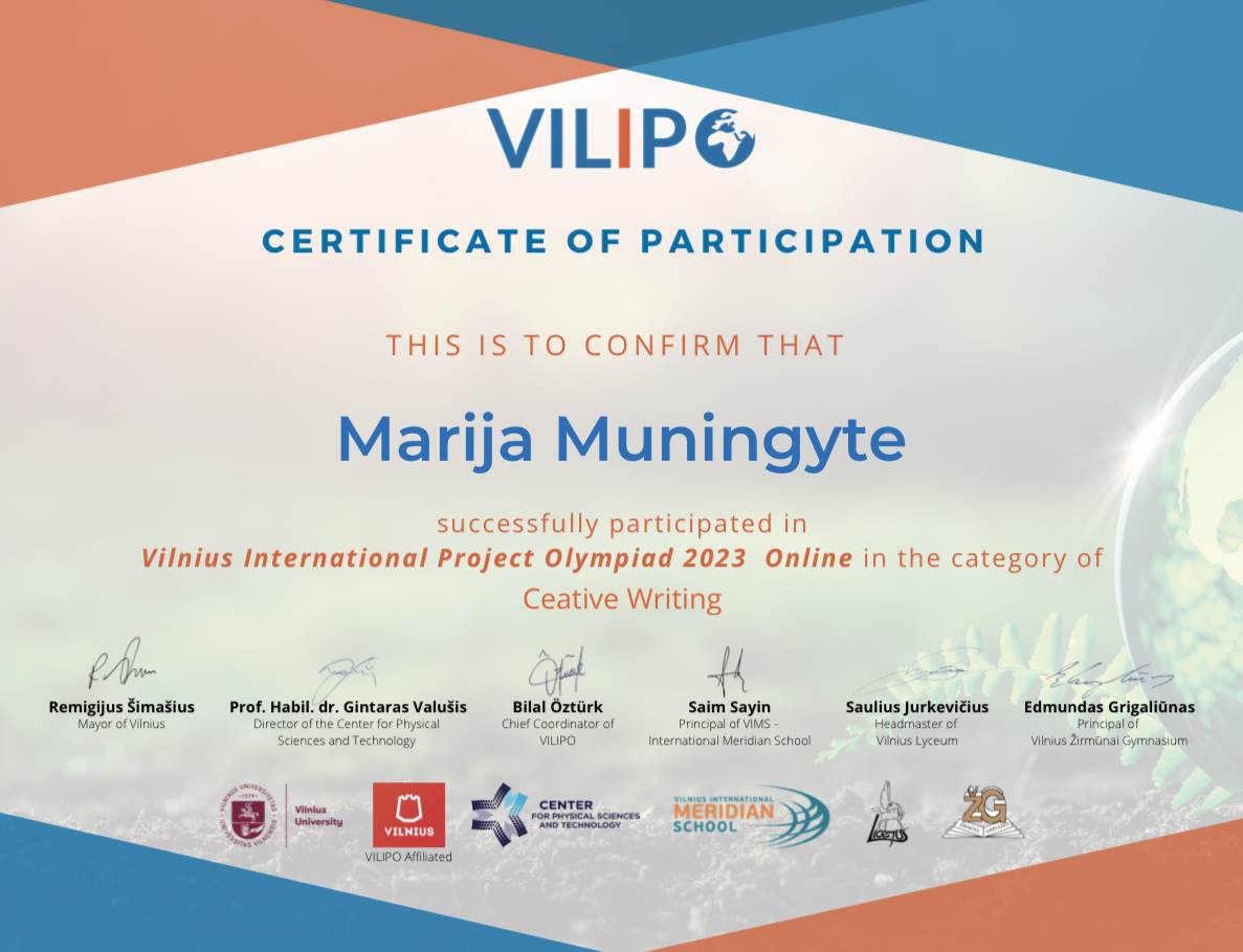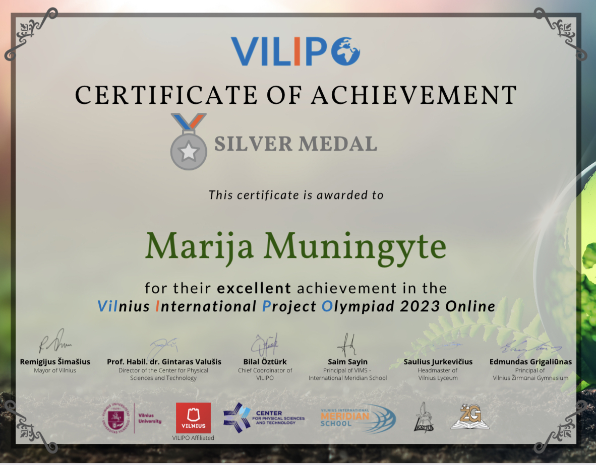Sveikiname Astrofizikos būrelio mokinę Mariją Muningytę, kuri tarptautinėje mokinių projektų olimpiadoje Vilnius International Project Olympiad – VILIPO tarptautiniame etape pelnė sidabro medalį. Nacionaliniame etape Marija pelnė bronzos medalį. (2023-05-15)