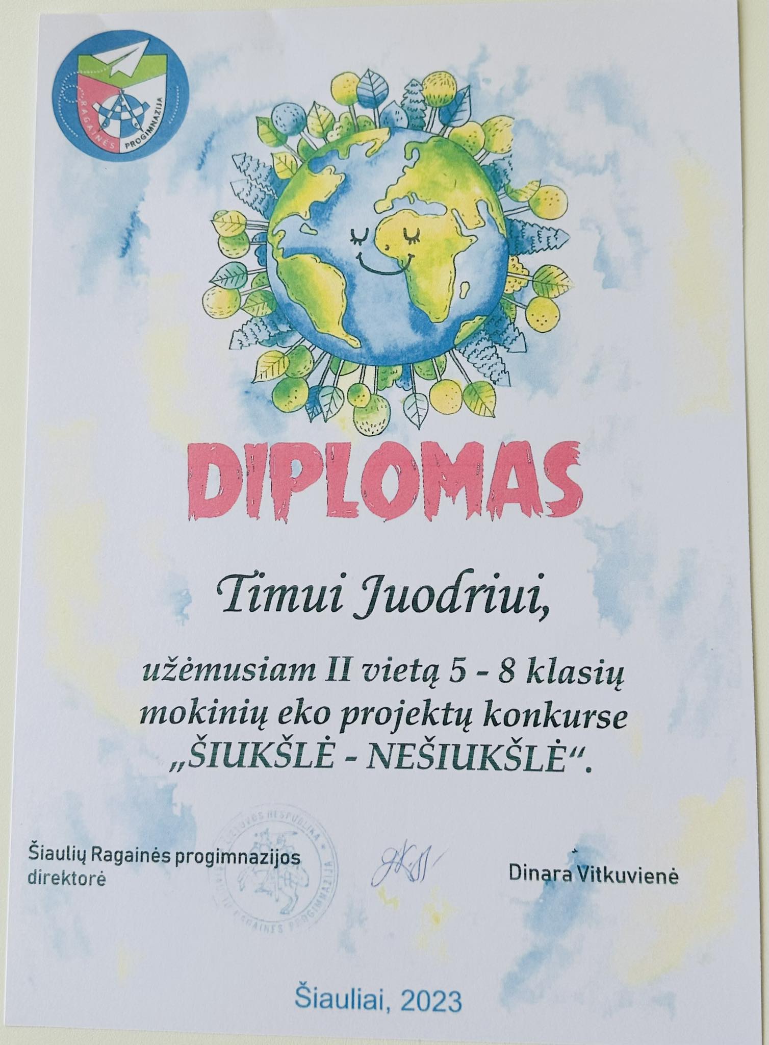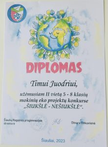 Sveikiname „Elektronikos ir valdomų modelių” būrelio mokinį Timą Juodrį, kuris respublikiniame ekologinių projektų konkurse „Šiukšlė – nešiukšlė” 5-8 klasių kategorijoje užėmė II vietą. Mokytojas J.Dedūra.