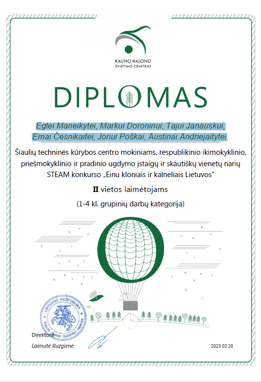 Šiaulių techninės kūrybos centro mokiniai Eglė Maneikytė, Markas Doroninas, Tajus Janauskas, Ema Česnikaitė, Joris Poška, Austina Andriejaitytė respublikinio ikimokyklinio, priešmokyklinio ir pradinio ugdymo įstaigų ir skautiškų vienetų narių STEAM konkurso „Einu kloniais ir kalneliais Lietuvos” II vietos laimėtojai (1-4 kl. grupinių darbų kategorijoje) Mokytoja J.Muningienė