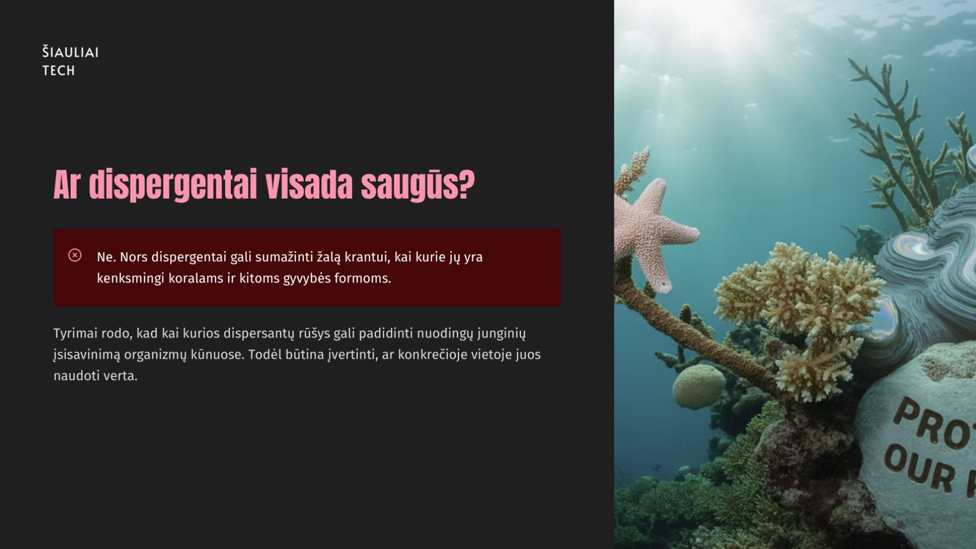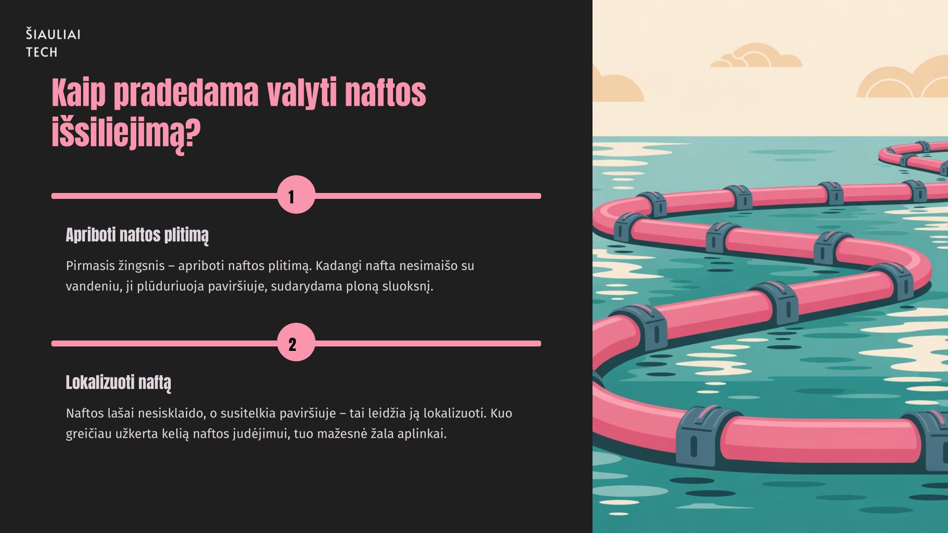 Todėl realiose avarijose plovikliai naudojami labai atsargiai. Kartais jie padeda, bet dažnai tik apsunkina valymą. Geriausia – stabdyti plitimą ir sugerti naftą prieš jai pasklindant. Tu gali pažiūrėti šį video, kad sužinoti daugiau – https://www.youtube.com/watch?v=3DbSlAg3F3A&t=6s