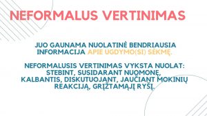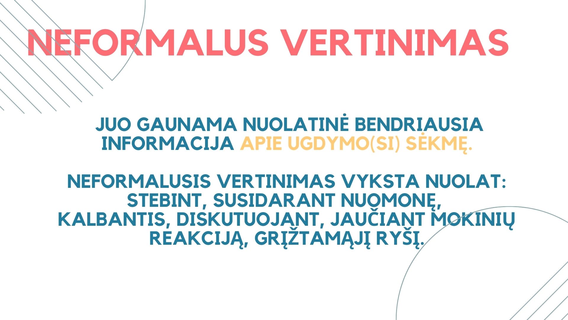 - Individualizacija: Neformalus vertinimas leidžia mokytojui labiau individualizuoti ugdymo procesą. Neformaliam vertinimui labiau būdingas didesnis dėmesys kiekvieno mokinio stiprybėms, pasiekimams ir poreikiams.