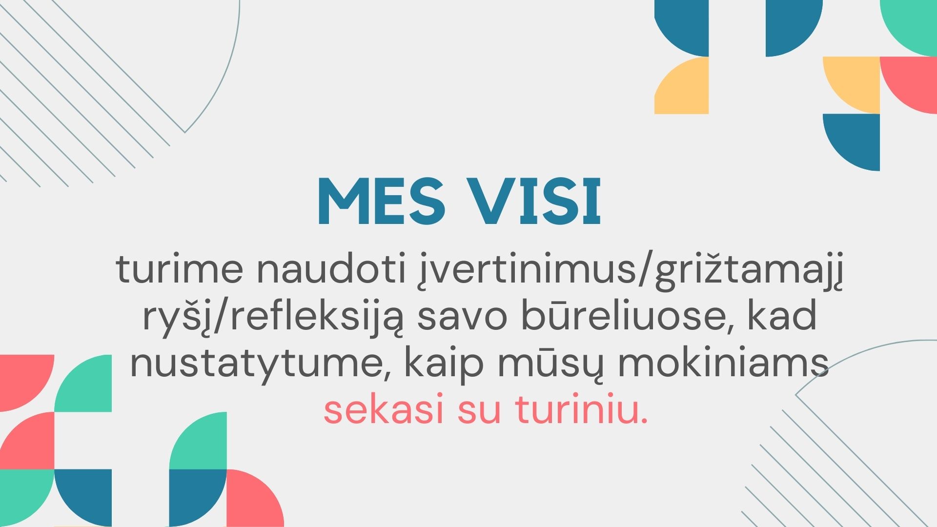 - Mokymosi proceso supratimas: Neformalus vertinimas padeda mokytojui geriau suprasti, kaip mokiniai mokosi ir kokie veiksniai daro įtaką jų pažangai. Mokytojui suteikiama galimybė stebėti mokinių elgesį, sąveiką su aplinką, jų požiūrį į ugdymo turinį. Tai leidžia pritaikyti mokymo procesą, suteikti tinkamus iššūkius ir palaikyti mokinių motyvaciją.