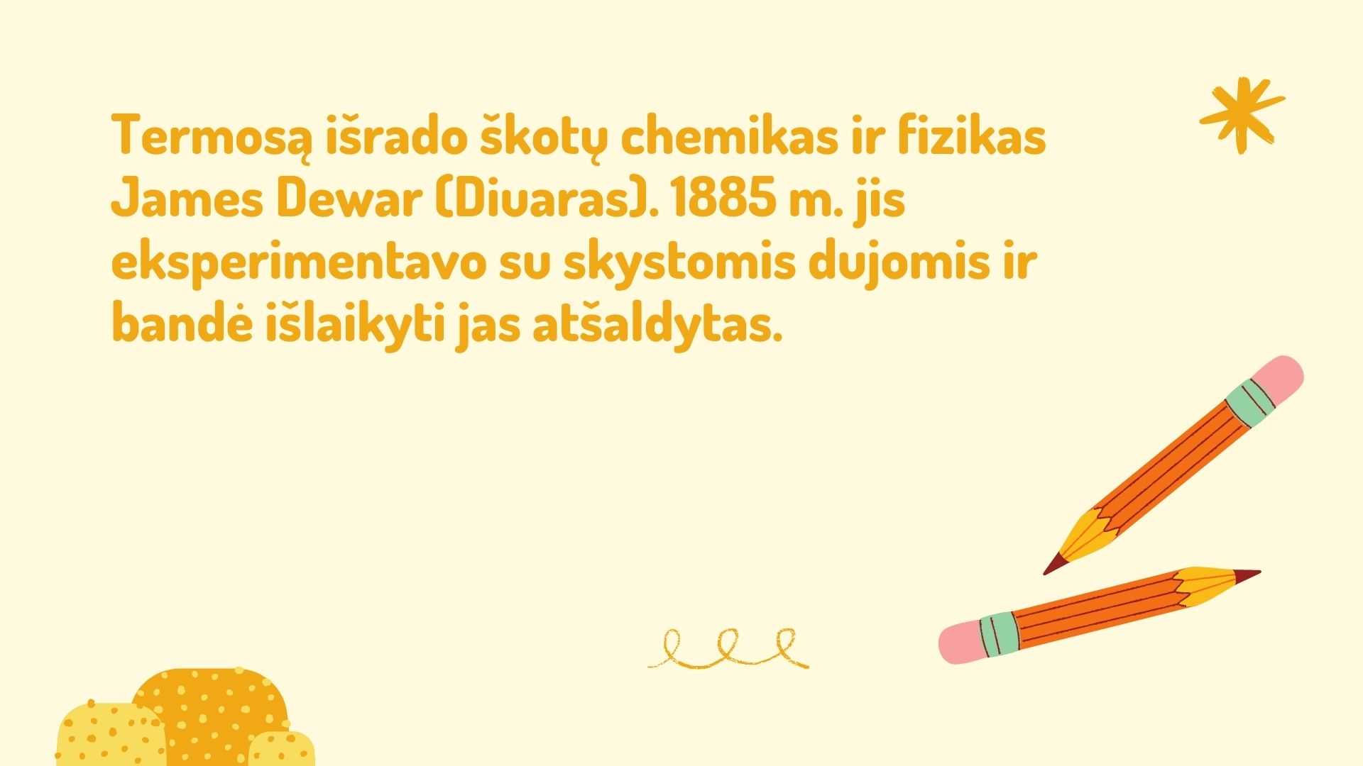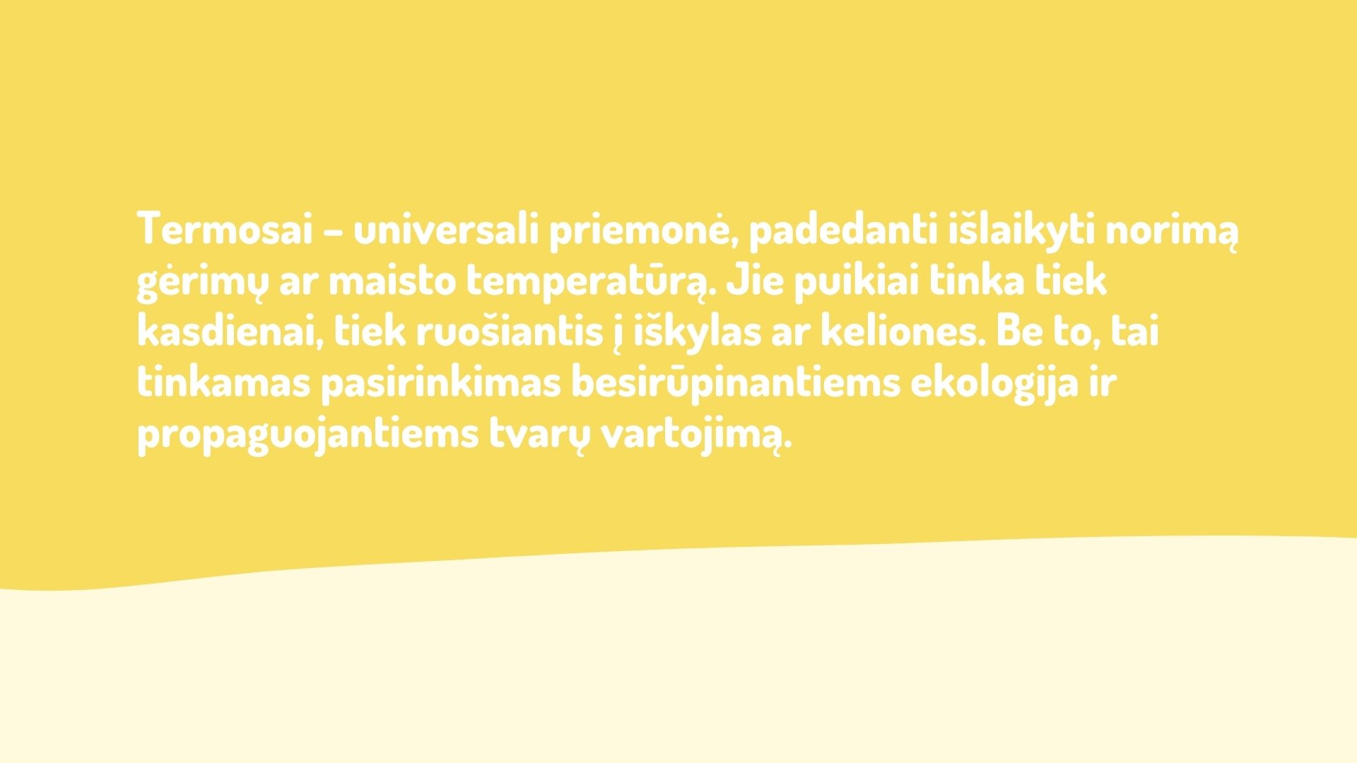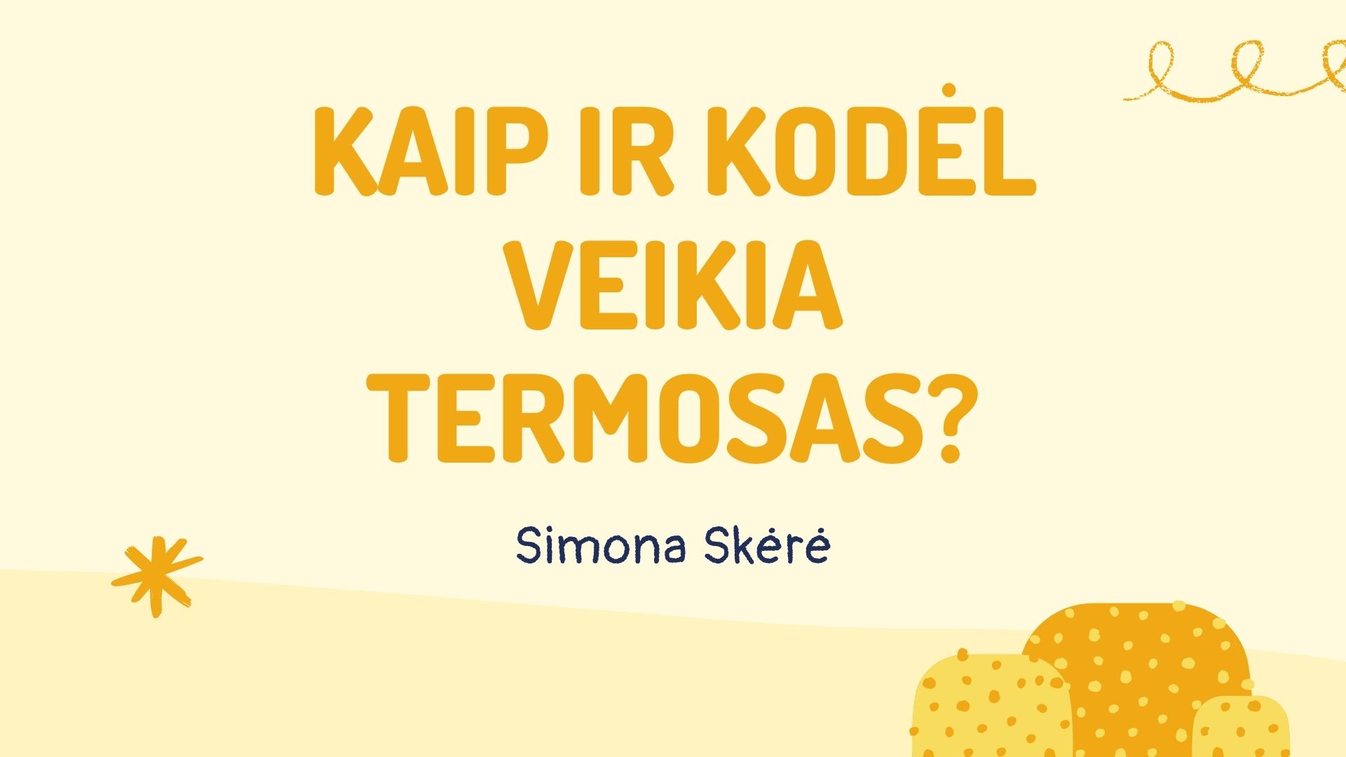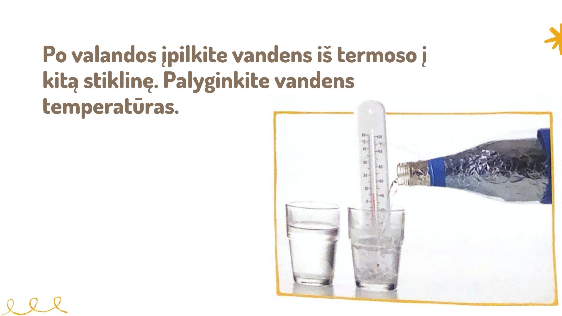 Užsiėmimo metu susipažįstama su pagrindinėmis termoso savybėmis, jo istorija. Aptariamos termoizoliacinės medžiagos – pagrindinė pamokos tema. Vaikai pamokos metu konstruoja termosą ir atlieka bandymą – tiria kaip termosas išlaiko temperatūrą. Bandymui atlikti skirtas darbo lapas pildomas kiekvieno mokinio. Kadangi bandymui naudojami panaudoti buteliai, galima kalbėti apie ekologijos svarbą, pasaulio užterštumą, globalines problemas. Naudojant termosus taip pat siekiama skatinti tvarumą.