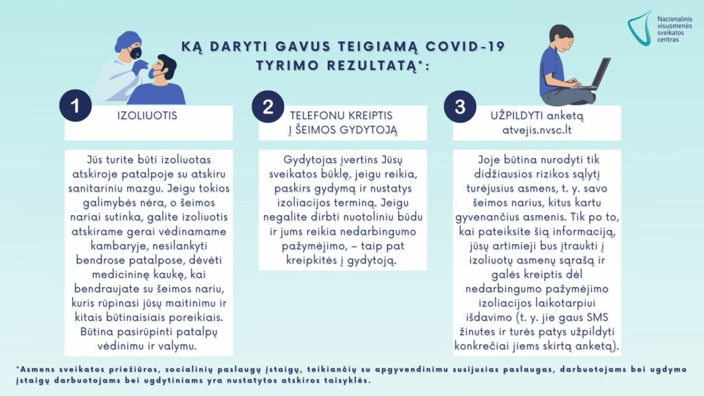 Todėl, Jums ar Jūsų vaikui gavus laboratorijoje atlikto teigiamo antigeno/SARS-CoV-2 PGR testo rezultatą, kuriuo buvo patvirtinta COVID-19 liga, prašome nedelsiant savarankiškai užpildyti elektroninę anketą NVSC interneto puslapyje, adresu https://atvejis.nvsc.lt.