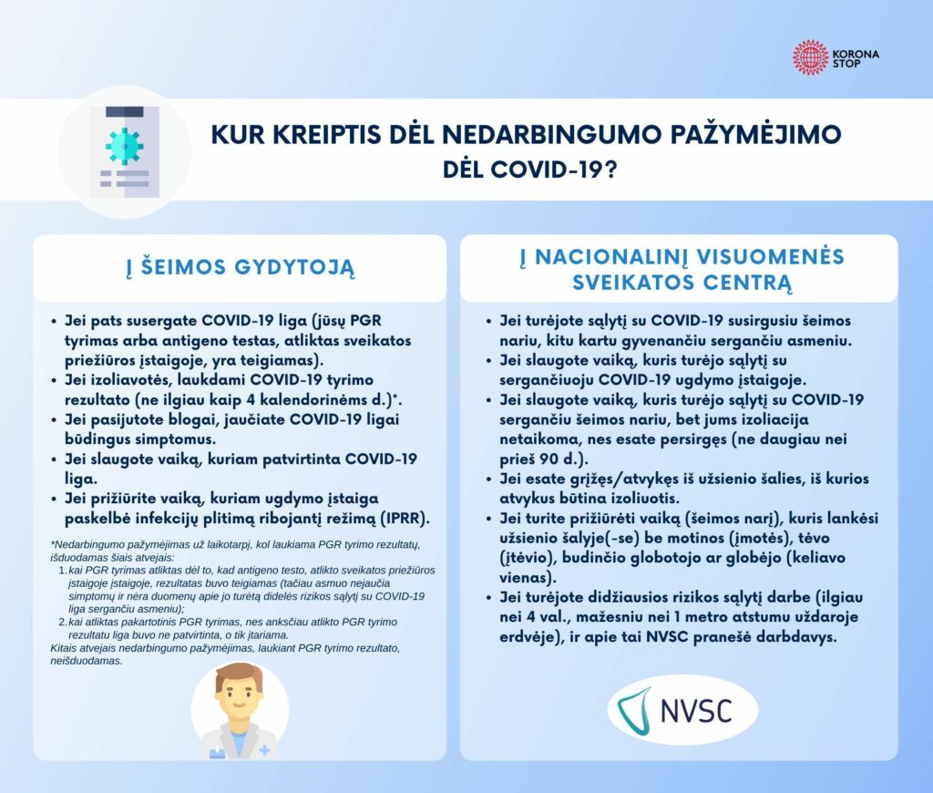 Nedarbingumo pažymėjimų dėl privalomos izoliacijos išdavimas: https://nvsc.lrv.lt/lt/nedarbingumas