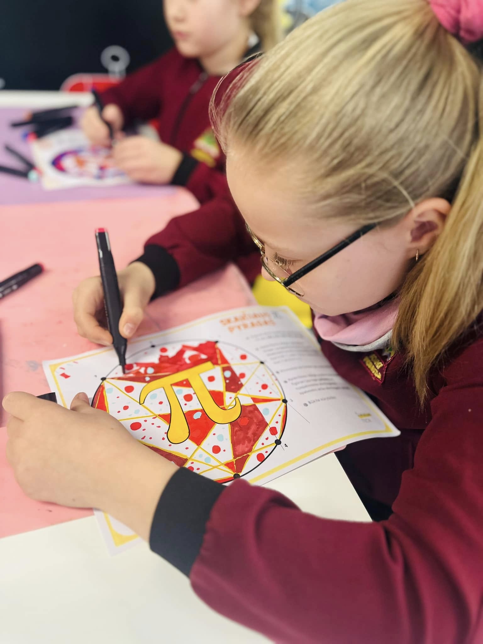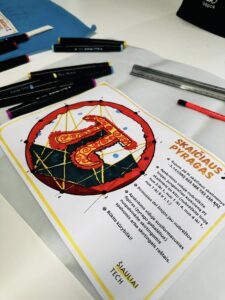 Edukacijos metu kiekvienas dalyvis turėjo galimybę sukurti „Skaičiaus Pi pyragą“ – spalvingą ir kūrybišką geometrinį piešinį, sudarytą pagal Pi skaitmenų seką. Vaikai jungė taškus, kuriems priskirti Pi skaitmenys, ir taip kūrė unikalius grafinius darbus, lavindami ne tik kūrybiškumą, bet ir matematinį mąstymą. Užsiėmimo pabaigoje vaikai dekoravo savo „pyragus“ spalvomis, paversdami matematinį uždavinį tikru meno kūriniu.